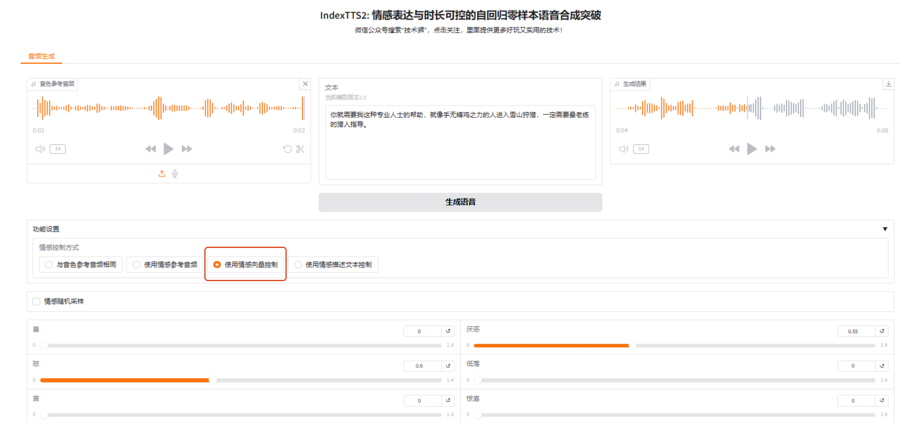 上传或本地录制音色参考音频,上传或本地录制情感参考音频,选择情感权重(0.4-0.8左右最佳),输入目标文本,点击生成语音。