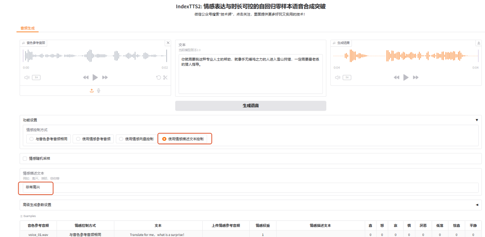 上传或本地录制音色参考音频,输入情感描述文本(非常高兴,愤怒,巨悲伤等),输入目标文本,点击生成语音。