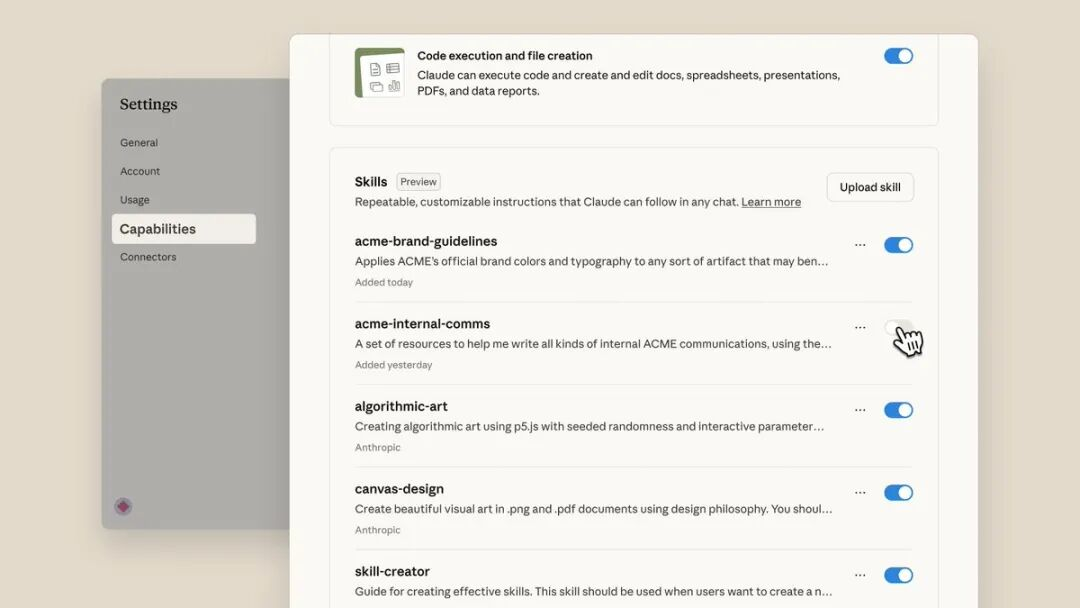 在 Claude 设置页面,有一些 Claude 内置的技能。