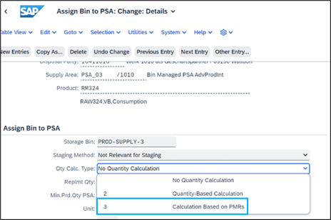 - PMR-Based Staging – In this release, the system can create a warehouse task for a product to be staged to the production supply area by adding up all open product quantities from different production material requests. To do this, select the quantity calculation type Calculation Based on PMRs in the Assign Bin to PSA - Warehouse app (transaction /SCWM/PSASTAGE) and the Assign Bin to PSA app (transaction /SCWM/PSASTAGE2).