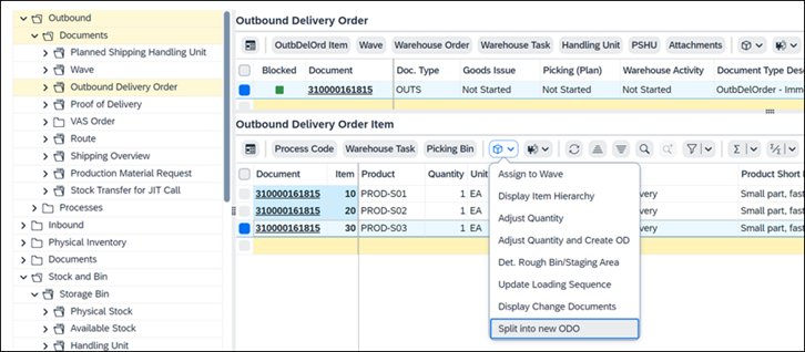This feature enables you to split delivery items or handling units (HUs) from an outbound delivery order (ODO) into a new ODO in the warehouse monitor. On delivery item level, you can split delivery items, or quantities of delivery items, without warehouse tasks into a new ODO. On HU level, you can split entire HUs or the remaining parts of a delivery, for example, unpacked items, into a new ODO.