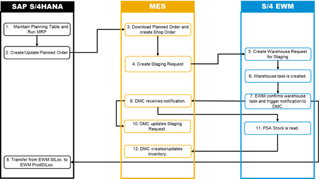Furthermore, if you integrate with a manufacturing execution system (MES), you can use MES-driven staging to create detailed plans for fulfilling staging requirements for repetitive manufacturing processes. The staging request that being created in MES system is mapped to a warehouse request of an internal stock transfer type in Extended Warehouse Management (EWM).