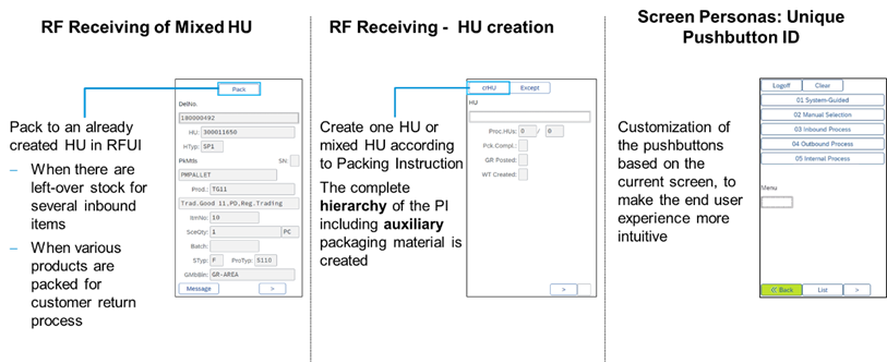 For some examples of these changes, you can open the Test RF Environment app and choose Inbound Processes -> Receiving of Handling Units. The following changes are implemented: