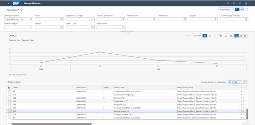 For example, during production you detect a defect in a component. Using the Record Warehouse Defect app in the QM component, you record the warehouse defect by assigning stocks to the defect. You can then trigger stock postings in EWM for one or multiple defective materials for further process.