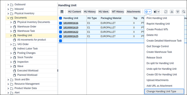 We also delivered a large amount of Warehouse Monitor enhancements to improve the ways users can search for available stock by a handling unit (HU) under Stock and Bin→ Available Stock. It is now possible to change the HU type of multiple HUs in one step. Furthermore it is also possible to use the Change Attributes method to make a mass change of multiple entries of physical stock at the same time. Additionally, users can also perform the following actions: