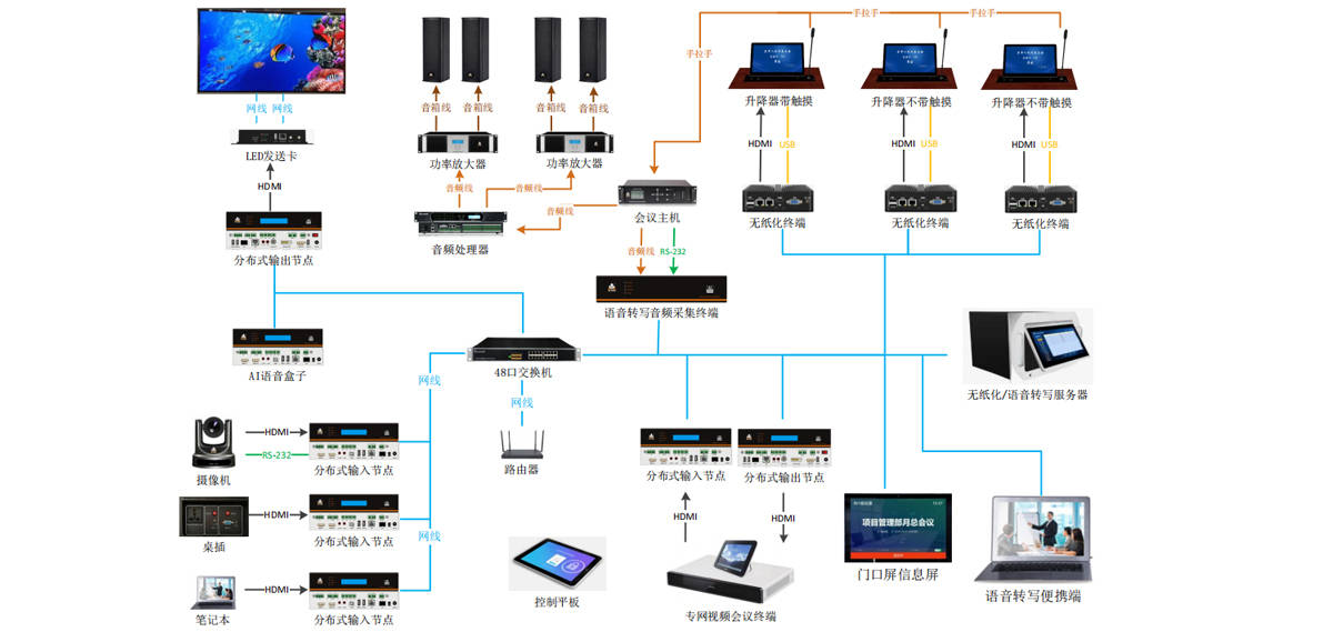 基于人工智能、物联网及数字化技术,构建集语音转写、无纸化会议、中央控制、智能扩声于一体的智慧化会议场景,旨在提升会议效率、降低成本、优化参会体验,适用于企业总部、政府机构、大型会议室等场景。该方案主要包含以下功能模块: