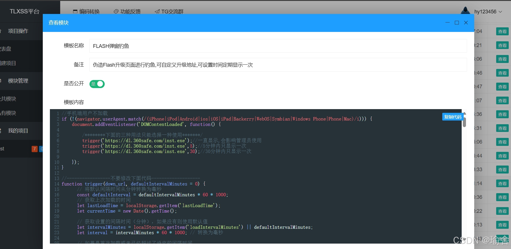 1,登陆XSS平台,在公共模板中找到flash弹窗钓鱼打开查看并复制代码
