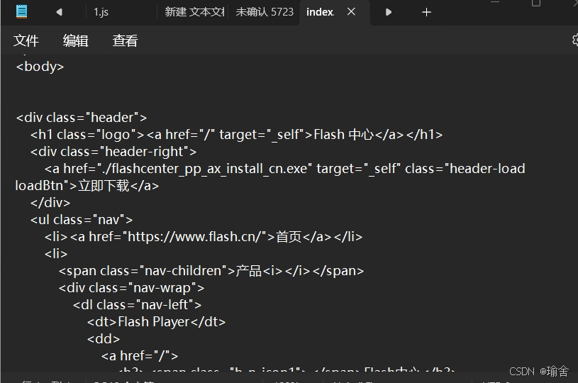 6,搭建一个类似flash官网的网站,将下图一中的最后六个文件放到假网站的根目录,下载的文件在index.html中修改,修改为真的flash安装包名字(如下图二所示),1.js中也使用真的flash安装包名字(如下图三所示)
