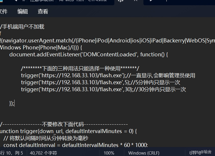 5,点击立即升级后会下载一个可执行程序,控制下载文件的代码在1.js中,新建一个文件并改名为flash.exe ,再将1.js文件进行修改,如图