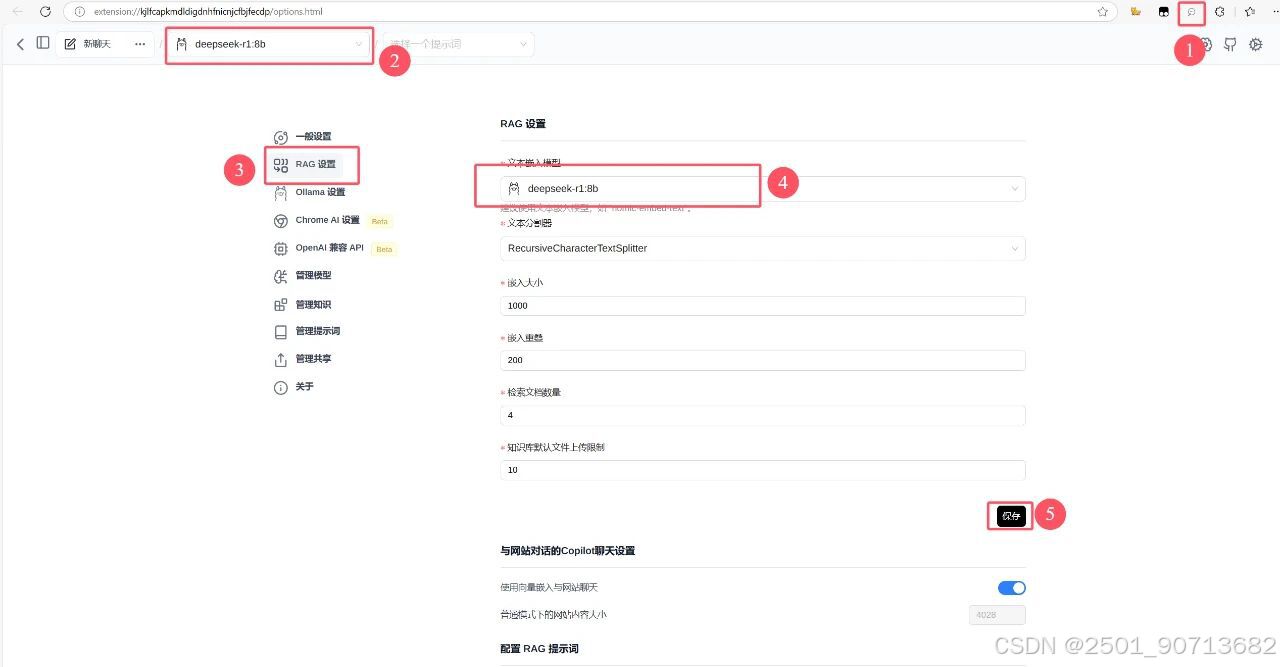 点击浏览器右上角的插件图标,选择好模型,在设置中的RAG设置中嵌入模型。在一般设置中选择中文。