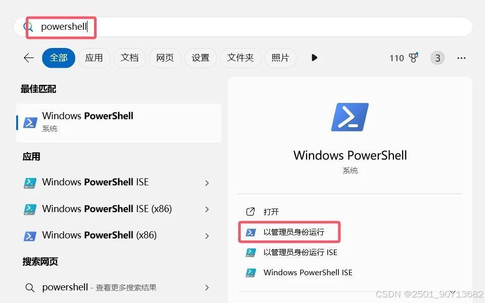 安装完成之后,以windows系统为例,在开始菜单中搜索powershell,然后以管理员身份运行。