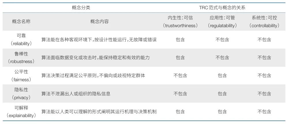 1. 可信算法与TRC范式的关系:智能算法的可信性一般指算法能被用户或社会认为是可信赖的、可依赖的,包括算法的鲁棒性、公平性、可解释性、隐私性、可审计性等,其定义包含于TRC范式之中。