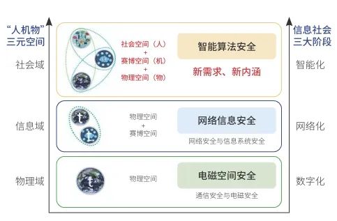 智能算法安全是涉及社会域安全的一门新兴学科,与其他安全类学科有一定的联系(图3)。在数字化早期阶段,物理世界数字化是主体任务,物理电磁空间安全是关键,着重解决通信安全、电磁安全与频谱控制等难题;随着互联网的发展,人机互联推动信息域与物理域融合,网络与信息安全问题凸显,网络安全与信息系统安全成为重点。当前社会已经进入智能化时代,万物互联,“物理—信息—社会”三元空间融合,算法成为影响智能社会运行的核心引擎之一,智能算法安全成为新的安全挑战。这种挑战的出现是信息社会发展演进的必然结果,不同于以往主要关注物理域和信息域的物理安全以及网络信息安全,智能算法安全的关注点更加聚焦于由智能算法带来的社会域问题,需要重新审视和构建安全保障的策略和措施。