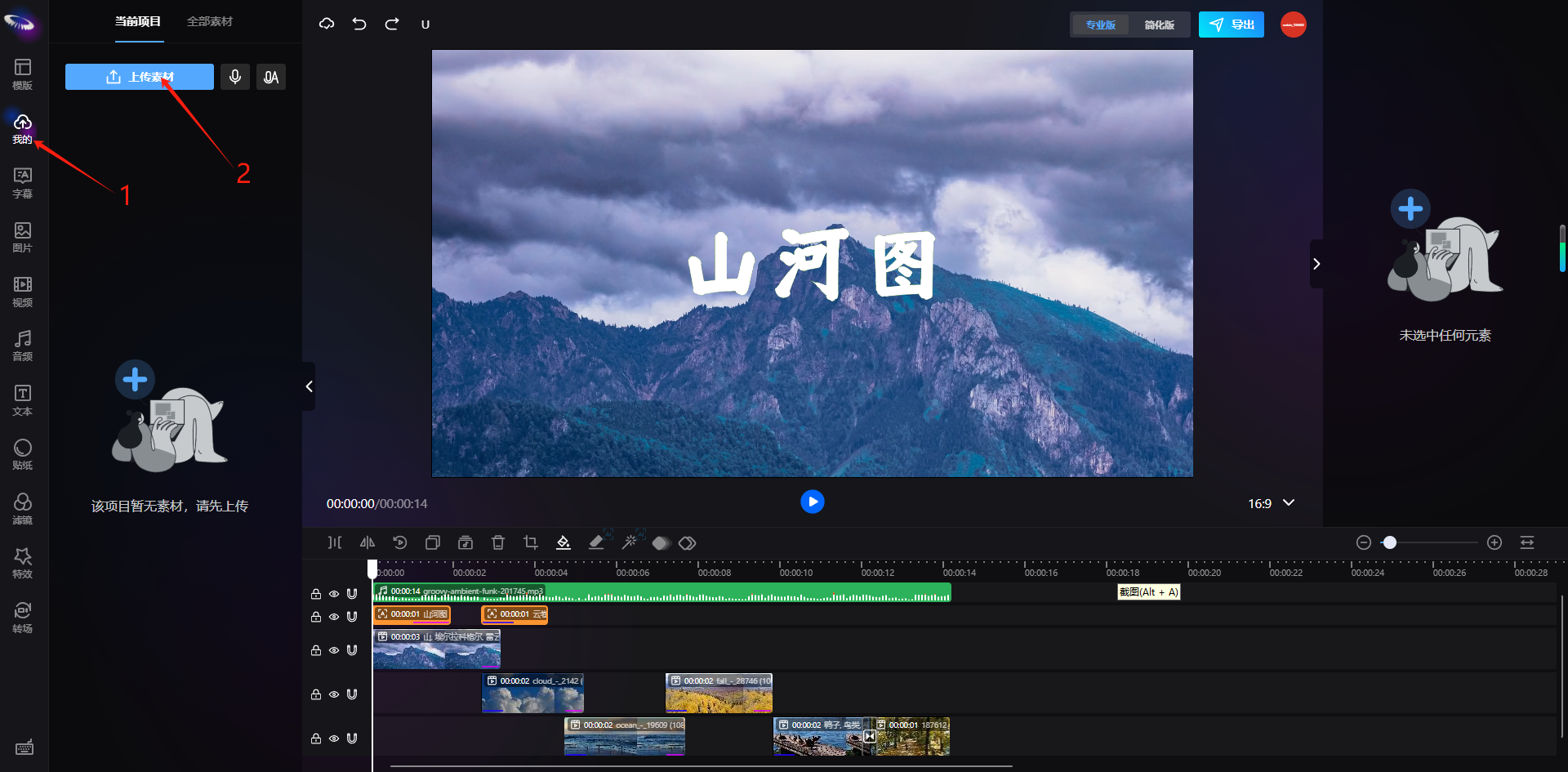 在创建的项目里,点击左侧“我的”1,在“当前项目”里,点击“上传素材”2的按钮即可。