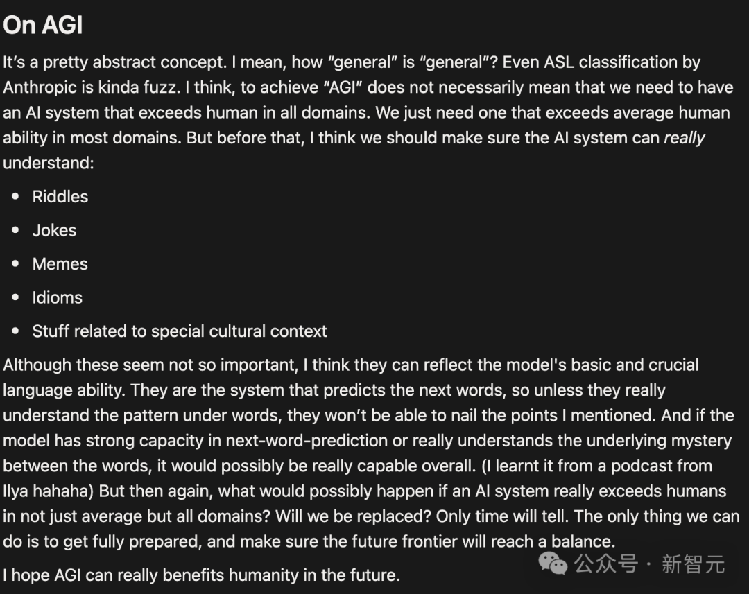 他认为实现AGI并不意味着需要打造一个在所有领域都超越人类的系统,而是需要创造出在大多数领域超过普通人类水平的AI。
