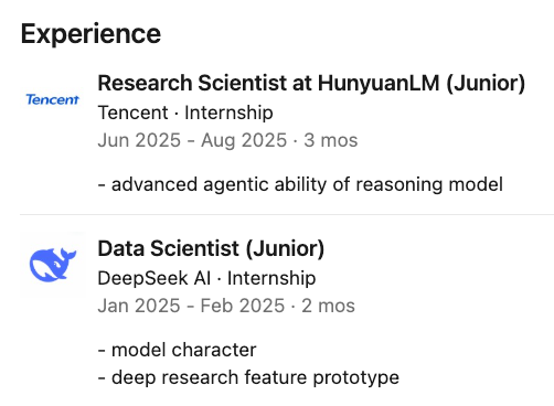 之后,他还在腾讯做过实习生,主要研究推理模型的高级自主能力(agentic ability)。