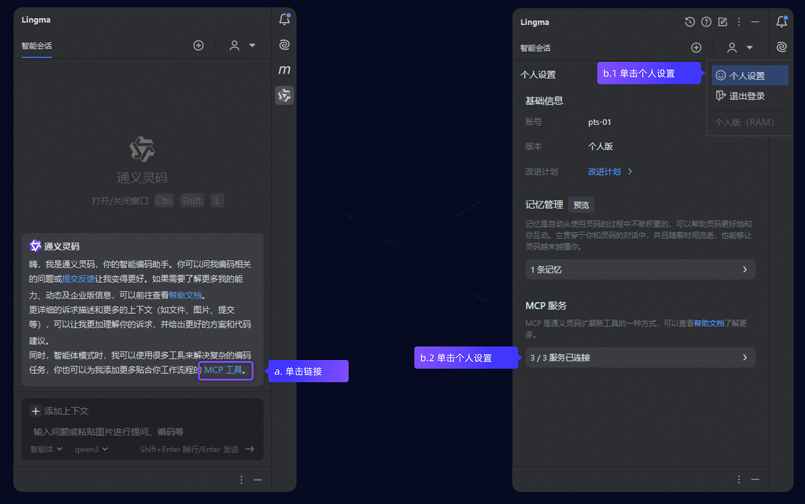 方式二:单击右上角头像,并在下拉菜单中选择个人设 置,然后在个人设置页面单击MCP 服务下的条形框。