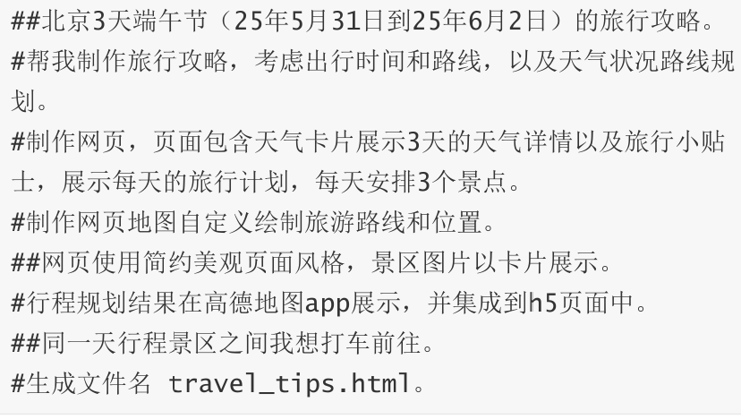 本文介绍如何使用通义灵码智能体与高德MCP 2.0 制作为期三天 的假期旅行攻略页面。同时,将生成的旅行攻略导入高德地图 APP,以便创建专属地图,以满足在行程中进行探店、导航、打 车及购票等出行需求。