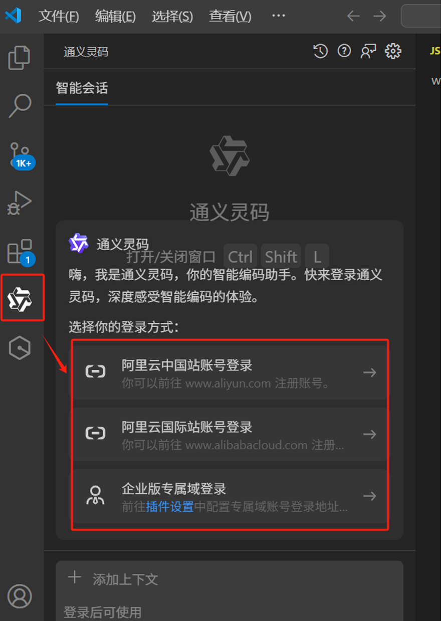 安装完成后,由于通义灵码依赖阿里云服务,必须登录账号才能正常使用。 在 VSCode 左侧的插件栏找到通义灵码图标,点击后按照提示进行登录操作。