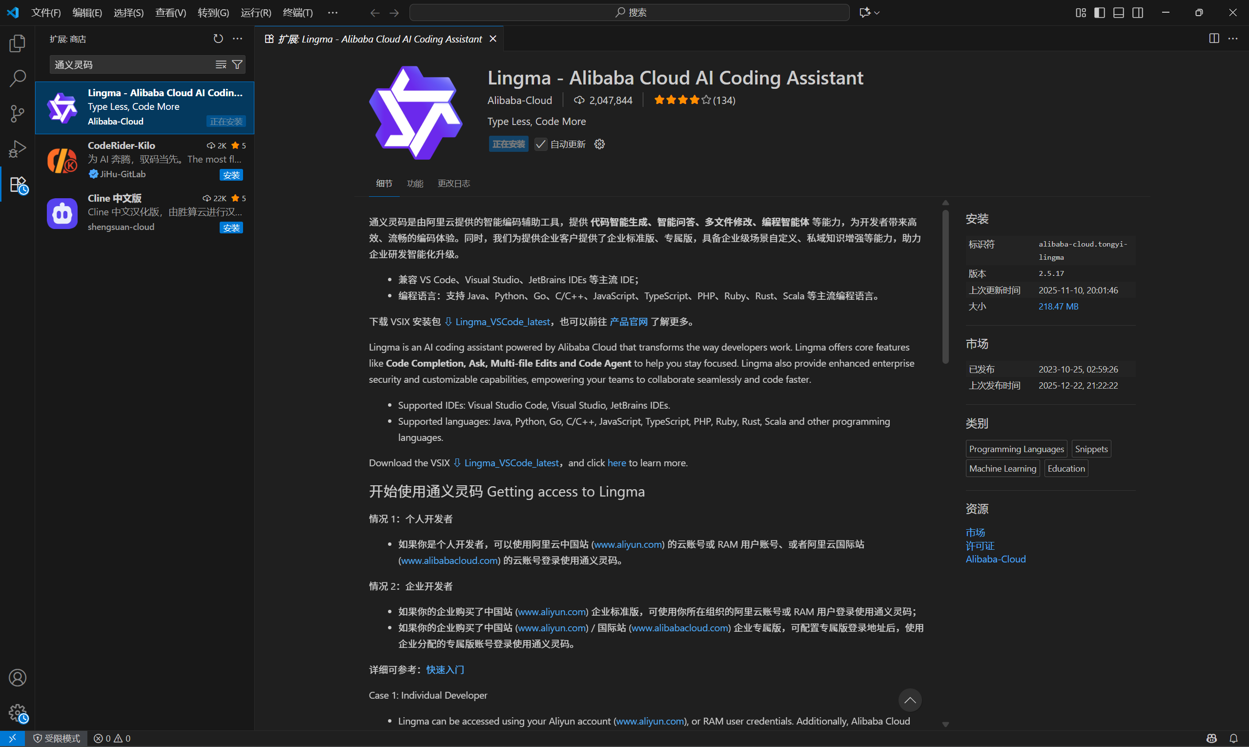 1.在VSCode中安装好通义灵码