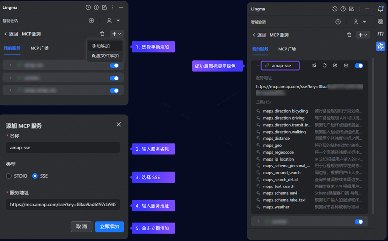 单击立即添加,等到链接图标变成绿色则代表MCP服务添加成功。