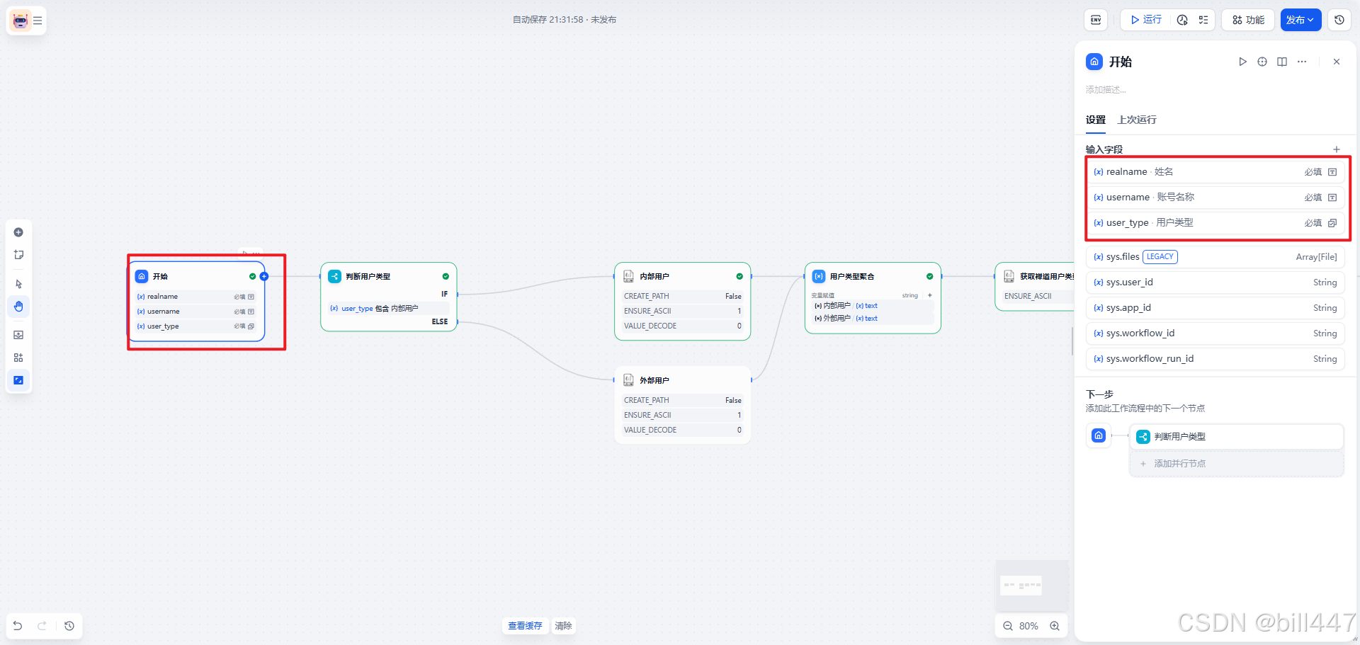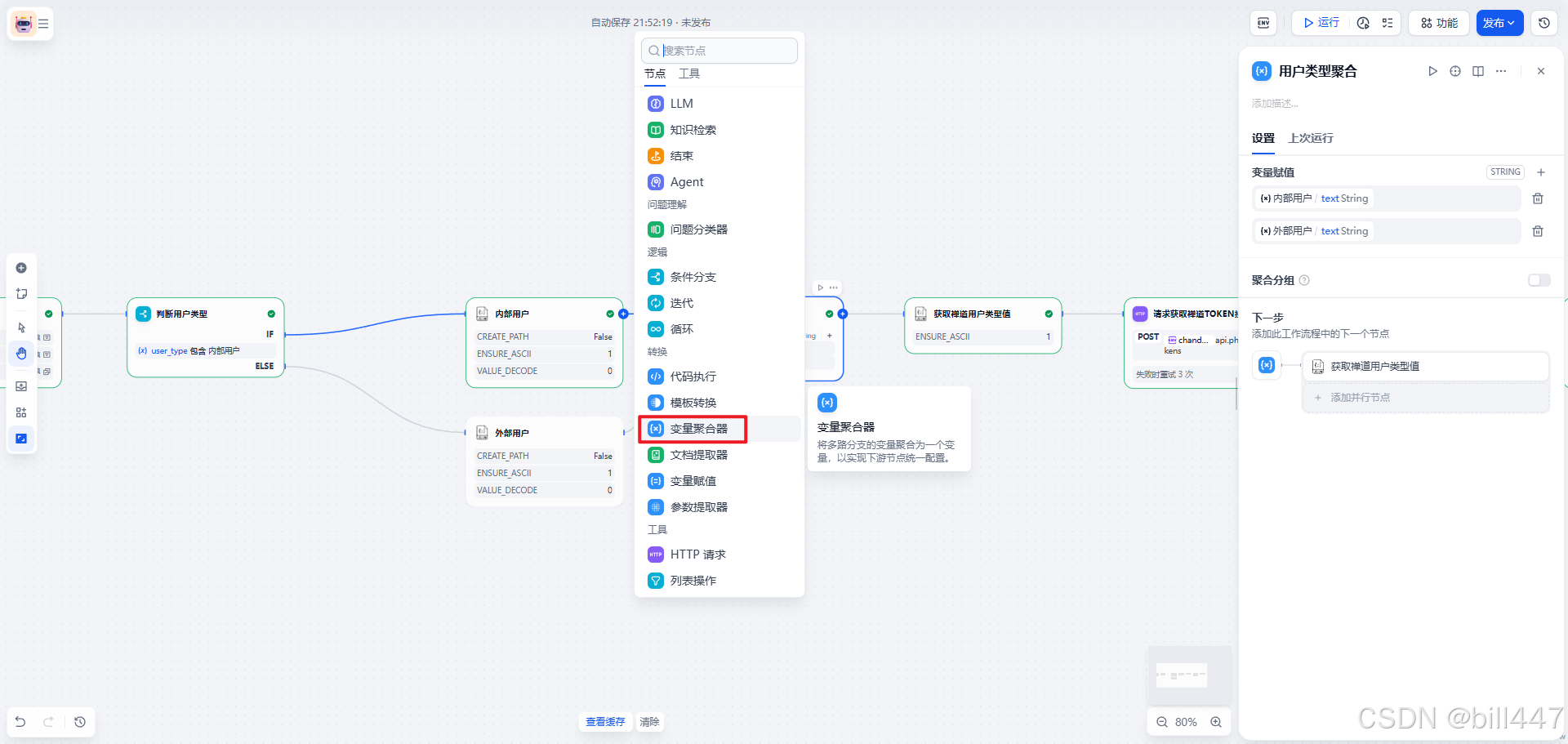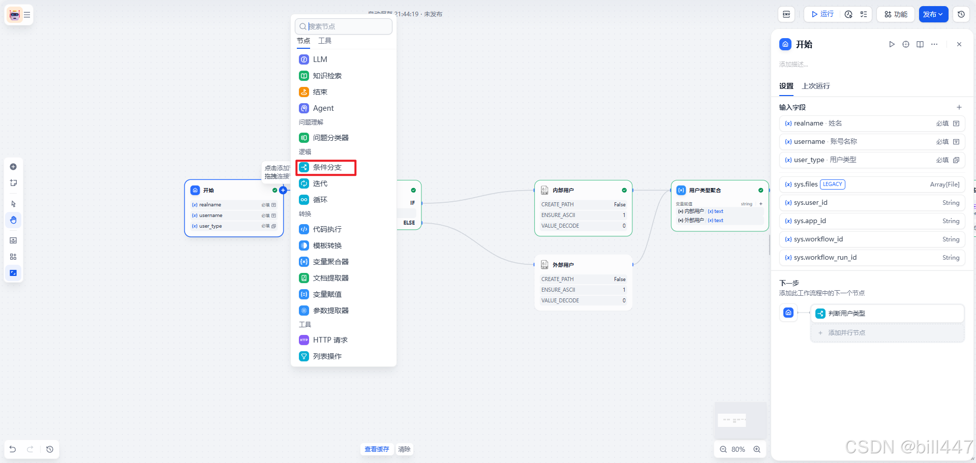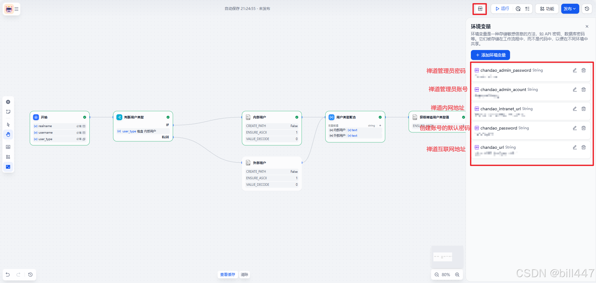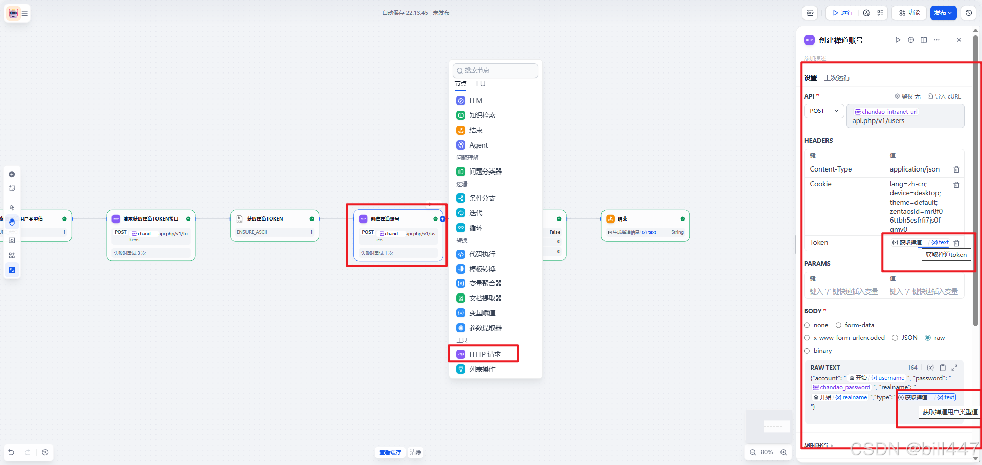 本文介绍了使用Dify 1.5.1创建工作流应用实现禅道账号自动创建的过程。主要内容包括:1)安装JSON处理插件;2)创建工作流应用并配置环境变量;3)设计包含13个节点的完整工作流,涵盖用户类型判断、JSON数据处理、HTTP请求等操作;4)通过条件分支处理内部/外部用户差异;5)最终实现账号创建功能并输出账号信息。文中详细说明了每个节点的配置要点,包括JSON插入格式、变量聚合等关键步骤,并