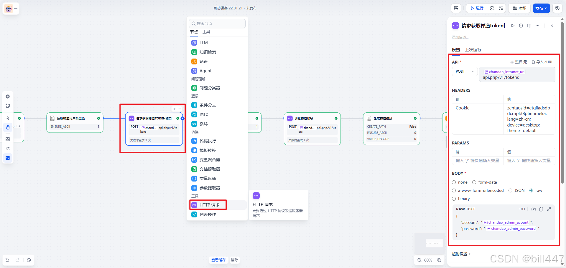 - 【请求获取禅道TOKEN接口】节点为【HTTP请求】。