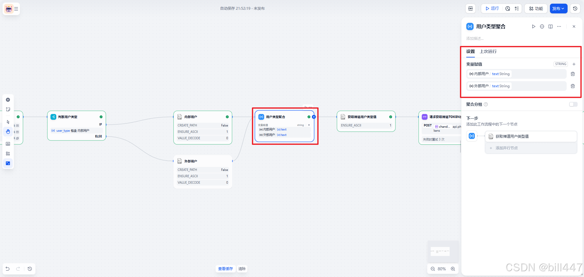 - 将【内部用户】和【外部用户】节点的值合并为一个对象值,后续会用到。