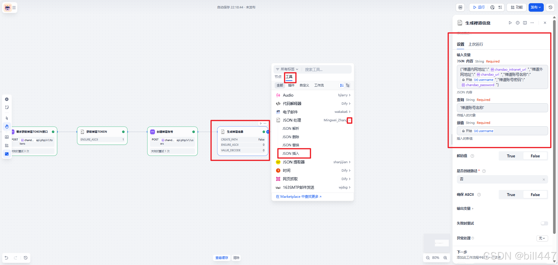 - 【生成禅道信息】节点为【JSON处理】中的【JSON插入】。