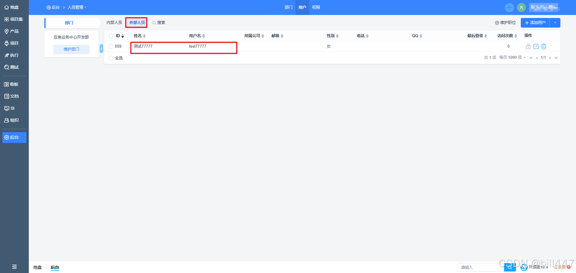 使用管理员登录禅道,打开后台->人员管理,点击外部人员,看到刚刚新建的账号