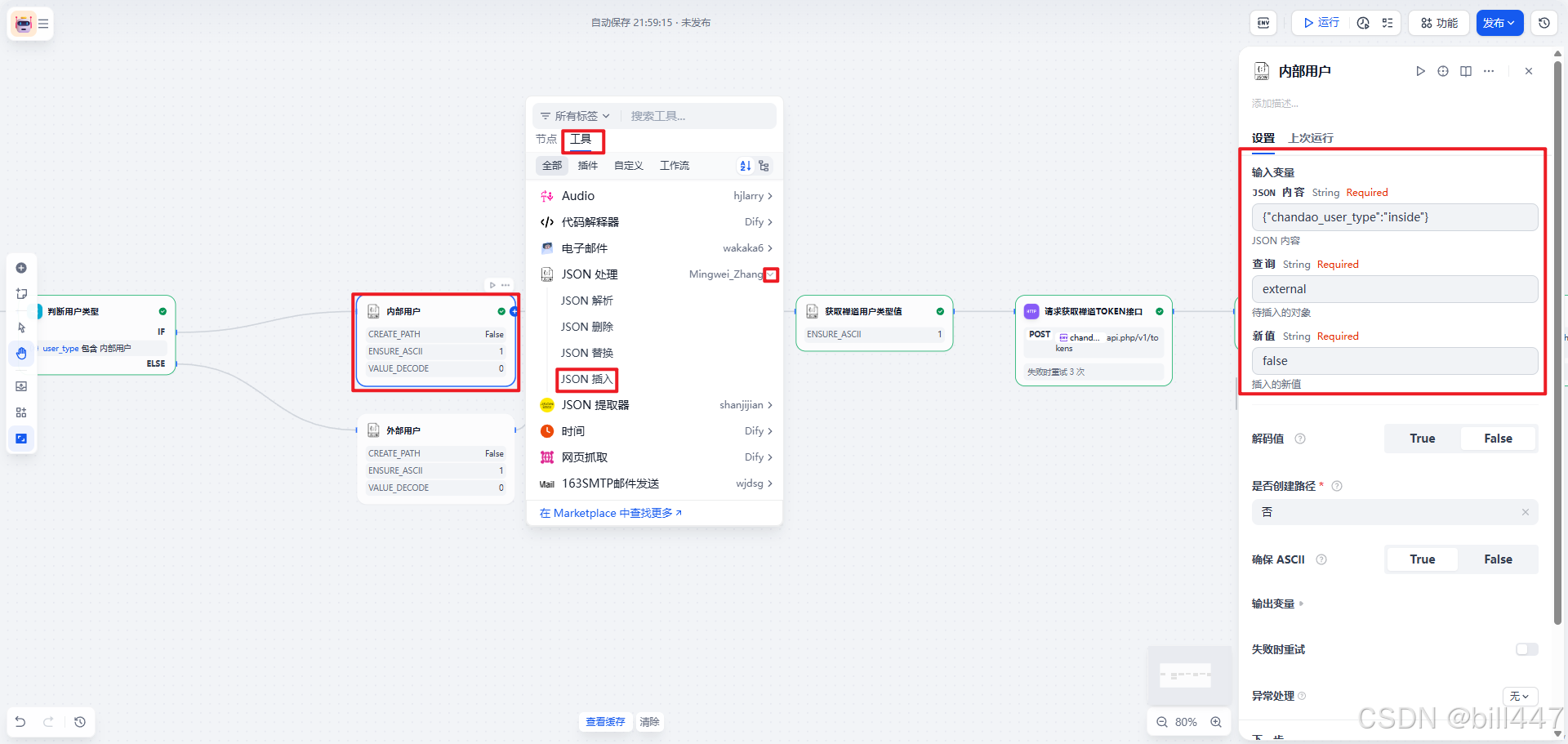 - 【内部用户】节点为【JSON处理】中的【JSON插入】。