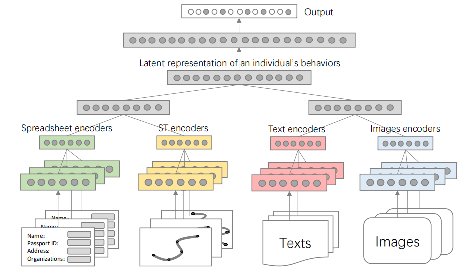 按照图8所示的例子,图10进一步展示了一个粗粒度知识融合范例,其中设计了四个不同的编码器(用四种不同的颜色表示),分别生成个人图像、文本、轨迹和电子表格数据的中间表示。然后,通过一些隐藏层聚合这四个数据集的中间表示,生成关于个人行为和兴趣的潜在表示。经过另一组隐藏层处理后,潜在表示将转换为一个输出向量,其中每个条目可以表示个人与特定位置之间的链接强度。有时,混合专家(MoE) 的思想可以应用于此范例中,根据输入激活大型模型中的不同模块(或专家),从而以更少的资源获得更准确的结果。