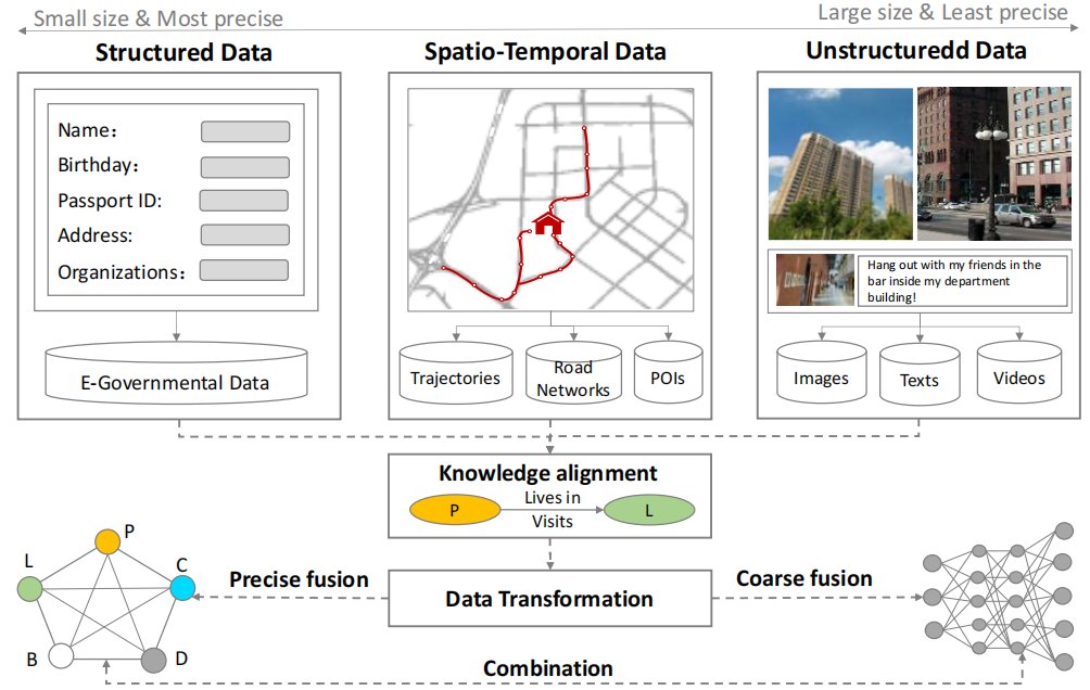 精确知识融合范式首先通过精确的数据转换方法,如地图匹配、图像分割和实体提取,尽可能准确地从每条数据中提取精确知识。然后,这些精确知识基于先前确定的数据之间的联系,在一些可解释的AI模型(如知识图谱、协同过滤和概率图模型)中被显式地链接起来。
