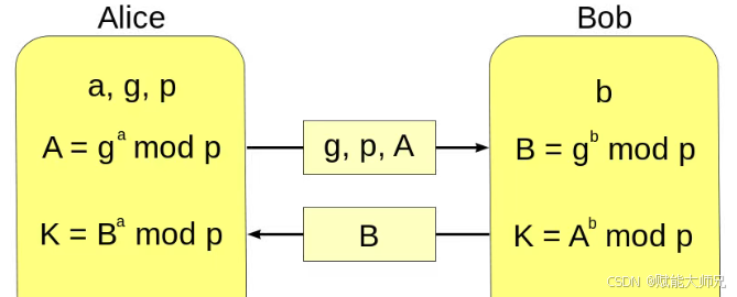 如上图,Alice和Bob需要协商秘钥,Alice选择一个随机自然数 a 并且将 g^a mod p 发送给Bob。Bob选择一个随机自然数 b 并且将 g^b mod p 发送给Alice。Alice计算 出g^{ba} mod p ,Bob计算出 g^{ab} mod p。因为在模p下 g^{ab} 和 g^{ba} 相等,最终Alice和Bob都得到了同样的值,即得出了公共秘密K。后续就可以把它用作对称密钥进行双方的加密通讯,因为这个密钥只有他们才能得到。