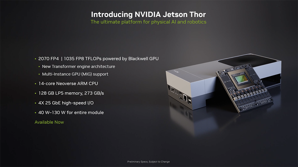 Jetson Thor与机器人AI软件平台搭配,支持各种主流AI框架,以及字节跳动、DeepSeek、阿里Qwen、谷歌Gemini、Meta、Mistral AI、OpenAI、Physical Intelligence(π)等企业的生成式AI模型。