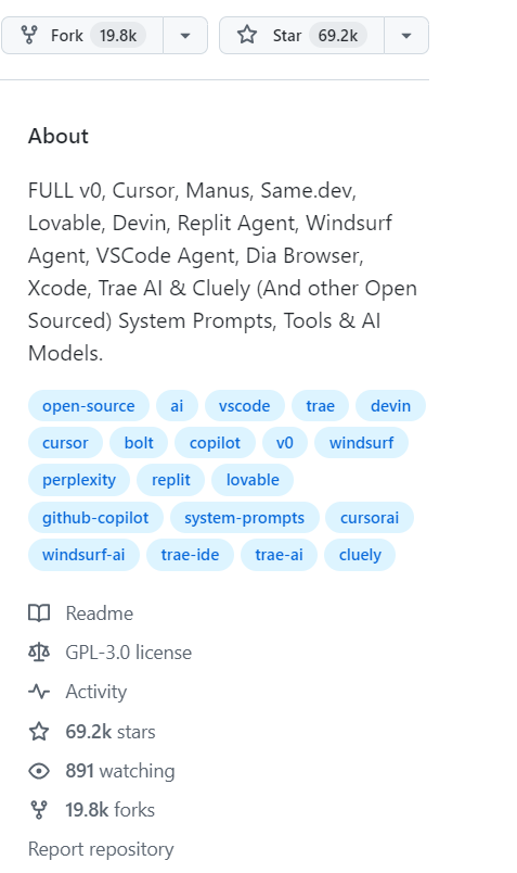 github开源项目,目前近70k Star,含主流AI编程工具,比如Cursor, Manus, Same.dev, Windsurf、VSCode 、Trae AI 等系统提示词。