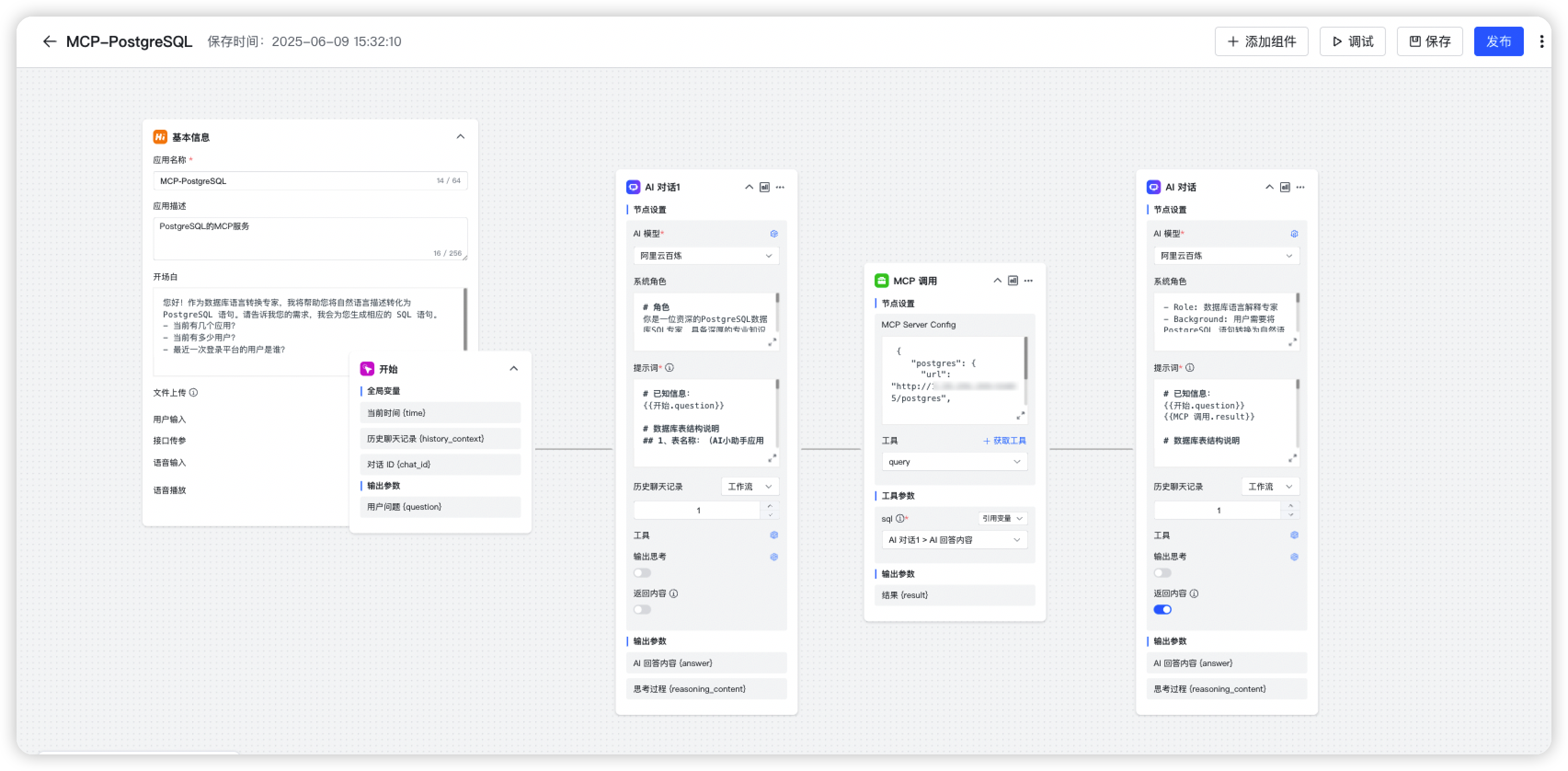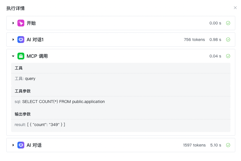 查看下整个工作流的执行详情,如图所示,通过AI生成SQL语句,通过MCP调用数据库,查询到结果以后由AI整理反馈给最终用户。