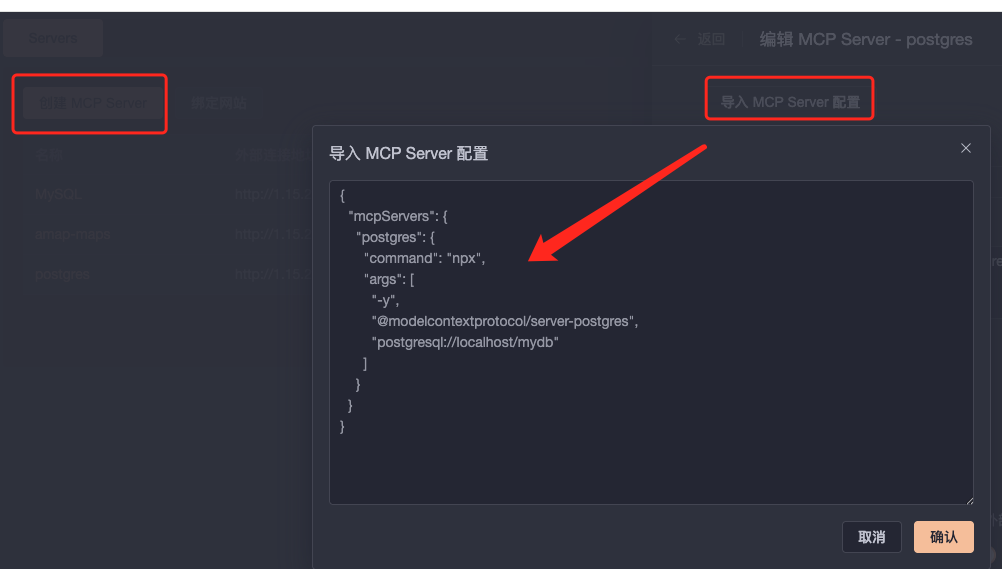 如下图所示登录 1Panel 后,进入 MCP 管理,点击创建 MCP Server,同时点击导入MCP Server 配置,将第四步在 mcp.so 中拷贝的信息黏贴确认即可。
