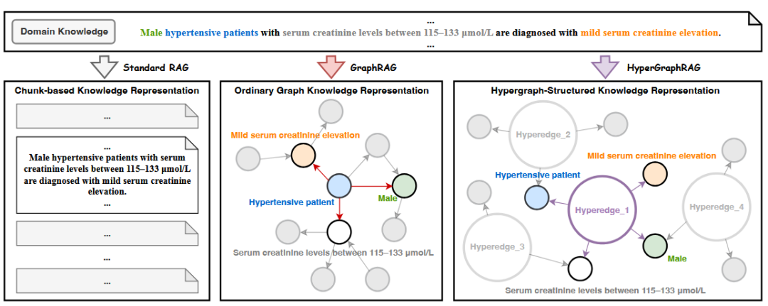 - 例如,对于上述医学领域的事实,可以用一个超边(高血压患者,男性,血清肌酐水平在 115–133μmol/L 之间,轻度血清肌酐升高)来表示,这种方式能够完整地保留知识的结构和语义信息。