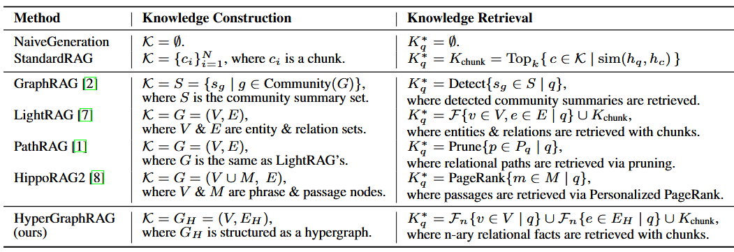 - GraphRAG 等基于图的 RAG 方法虽然通过图结构表示知识,能够捕捉实体之间的关系,但由于普通图只能表示二元关系,对于涉及多个实体的 n 元关系无法有效表示。