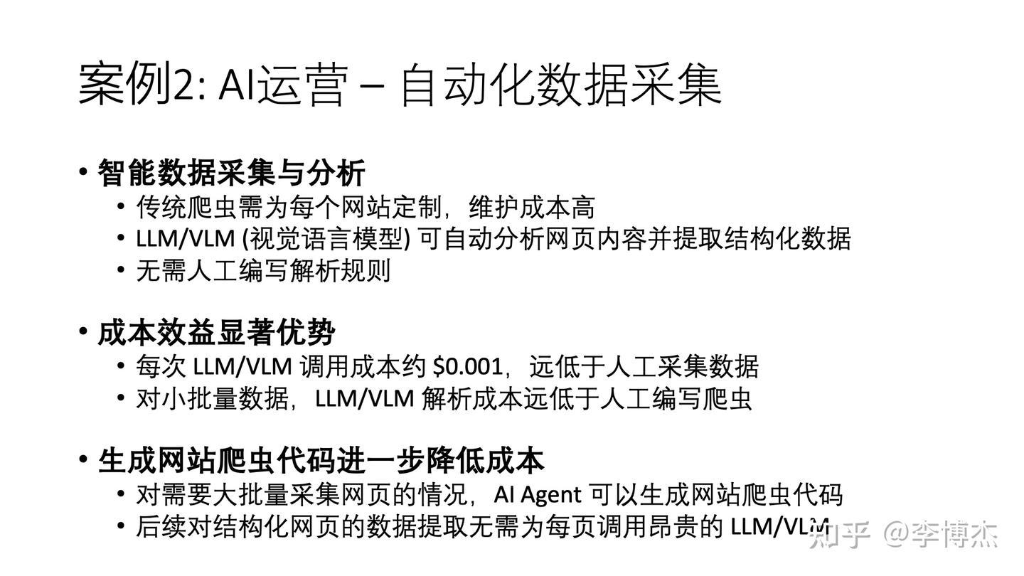 从成本效益角度看,优势更为明显。每次 LLM/VLM 调用的成本约为 $0.001,远低于人工采集数据的成本。对于一个典型的电商产品页面,AI 提取关键数据的成本约为 0.5-2 美分,而人工提取的成本在 10-50 美分之间—这是 10-25 倍的效率差异!