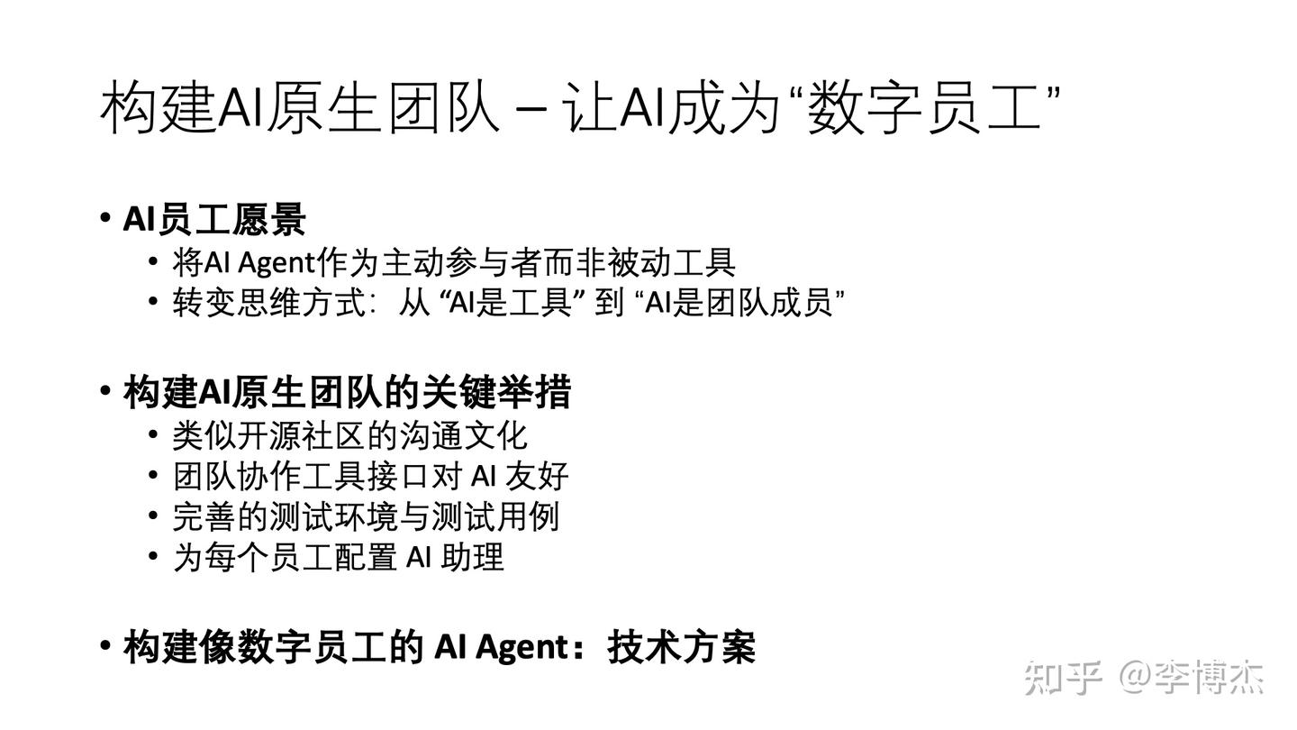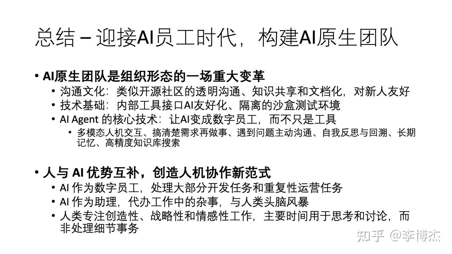 这不是天方夜谭。通过构建 AI 原生团队,我们可以创造一个环境,让 AI 真正成为高效的数字员工。这需要我们从组织文化、工具设计、测试环境和协作模式等多个方面进行系统性变革。