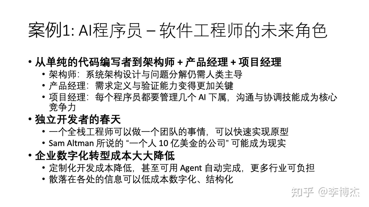 这个转变代表了软件工程师角色的未来方向:从单纯的代码编写者转变为架构师、产品经理和项目经理的复合角色。