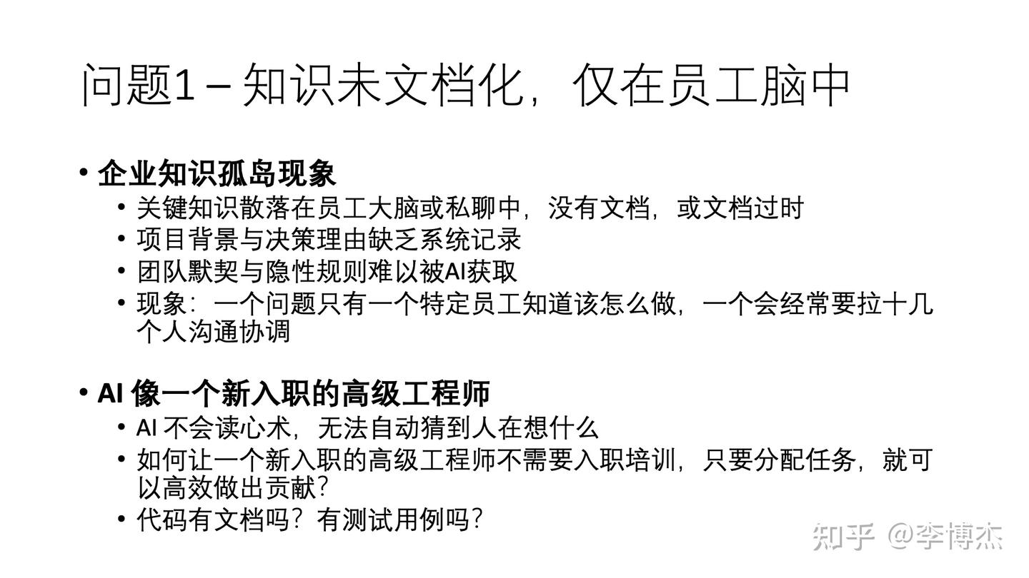 首先是企业知识未文档化的问题。我曾访问一家世界 500 强企业的 IT 部门,他们引以为豪地展示了他们的知识库。当我随机询问一个问题时,回答是:”哦,这个得问张工,他是唯一知道的人,但他上周刚离职。”这个场景太过熟悉了,对吧?