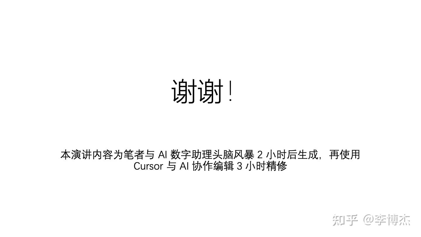 这篇演讲内容是我与 AI 数字助理头脑风暴 2 小时后生成的初稿,随后我又使用 Cursor 与 AI 协作编辑 3 小时完成精修,最后将 Markdown 格式的内容导出成 PPT 格式,还自动生成了这篇 2.5 万字的演讲稿。我用 5 小时时间,完成了之前需要二三十个小时才能完成的工作。