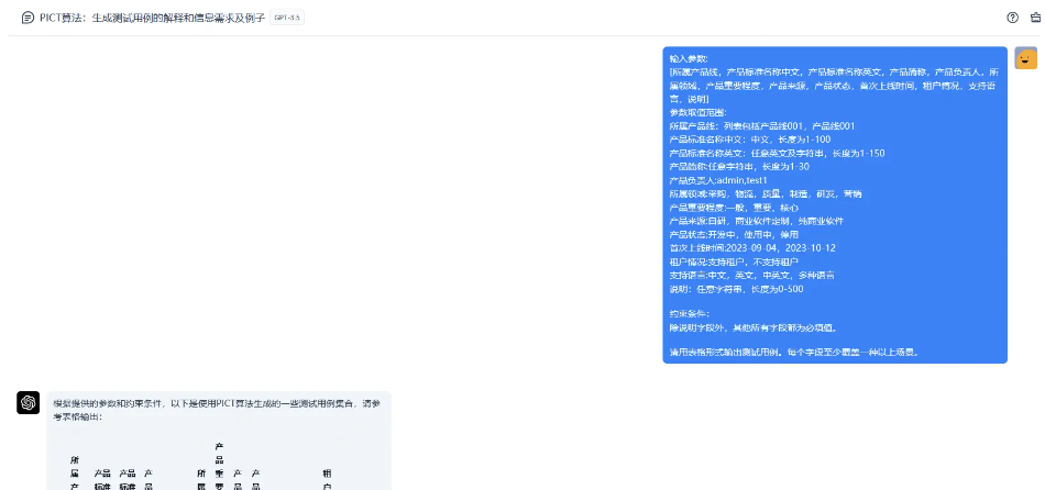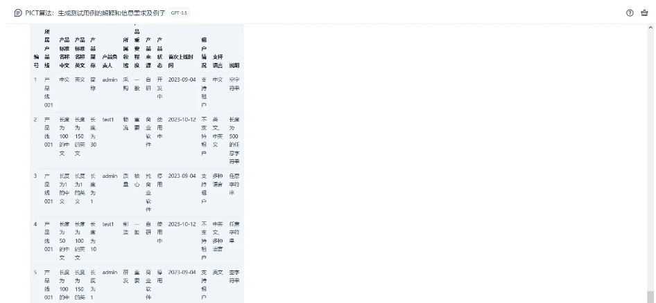 例:给出指定表单各个字段输入参数,参数取值范围及约束条件,需要chatGPT生成各种用例组合。说明:结果截图太长只展示了一部分。