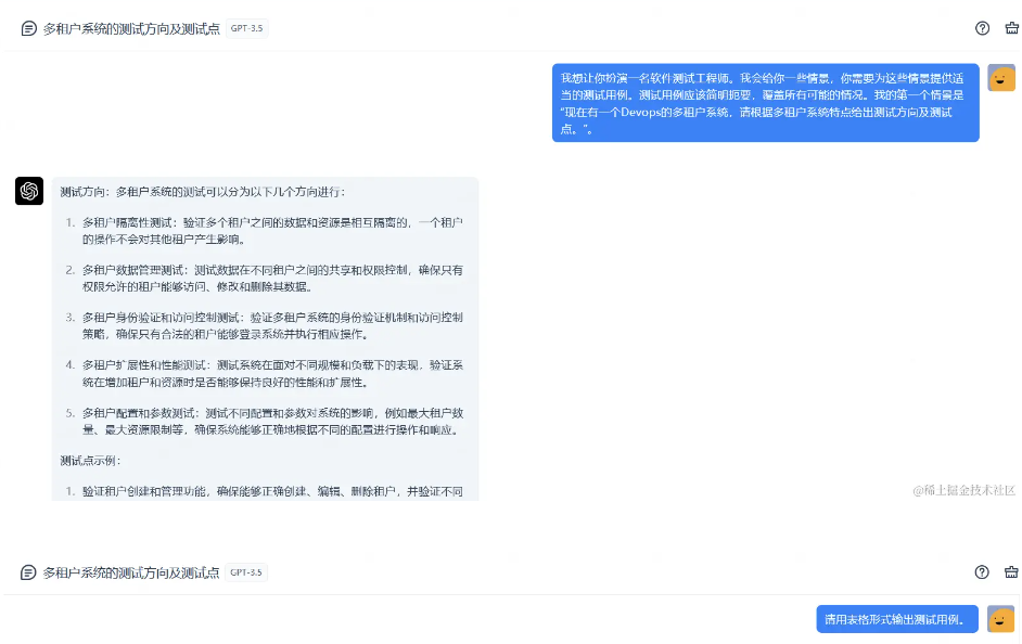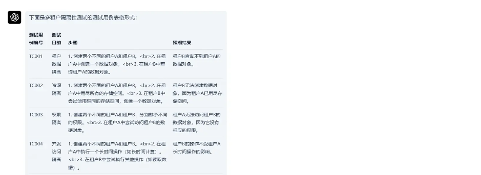 例:对于完全不了解多租户系统,完全可以让chatGPT给出一些测试点和方向。说明:结果截图太长只展示了一部分。