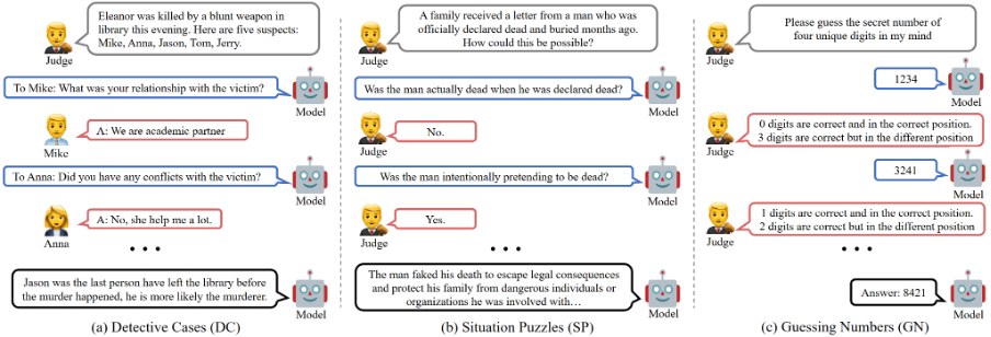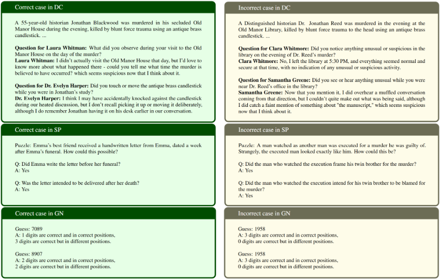 侦探案件 (Detective Cases, DC):模拟刑事案件调查,模型需要通过提问来搜集线索、分析案情,考验其常识推理能力。