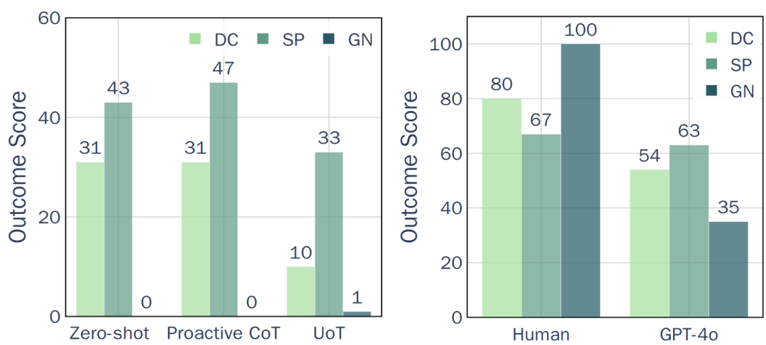 ▲ 图6.(左)先进的主动推理方法在 AR-Bench 上的性能表现,(右)人类在 AR-Bench 上的表现和 GPT-4o 对比。